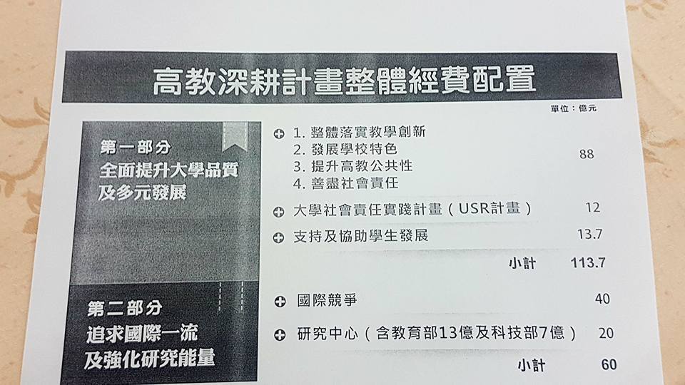 第一部分經費涵蓋「落實教學創新」、「發展學校特色」、「提升高教公共性」及「善盡社會責任」共88億元;「大學社會責任實踐計畫」12億元,及「支持及協助學生發展」13.7億元。第二部分60億元經費則用在 「國際競爭」與「研究中心」,分別有40億及20億元。其中研究中心部分,由教育部負擔13億元、科技部補助7億元。